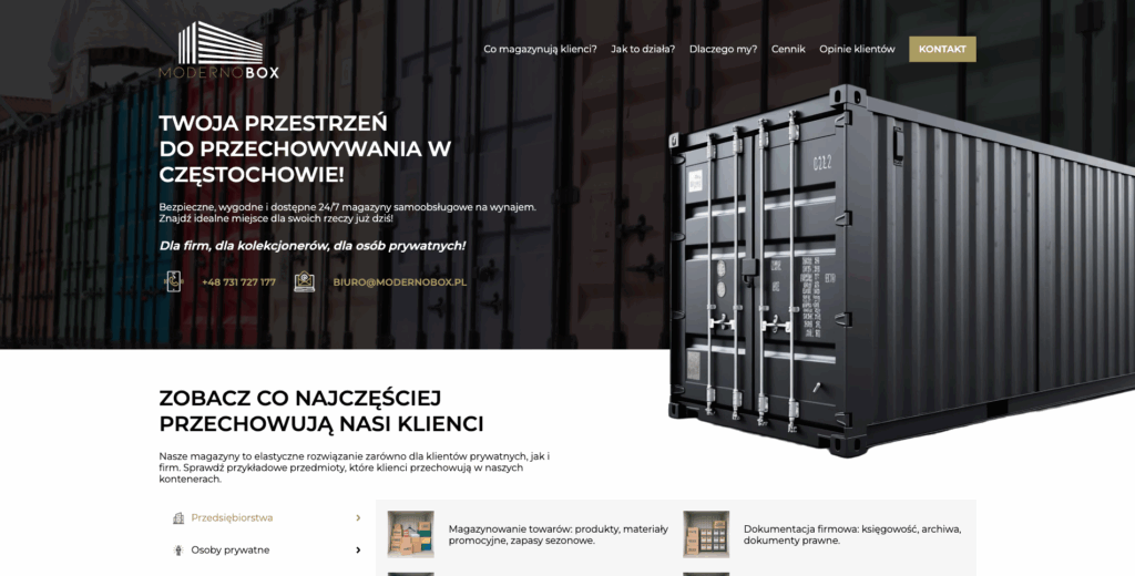 Lokalny biznes z Częstochowy szukał prostego landing page’a, który skutecznie wypromuje usługę wynajmu magazynów kontenerowych.